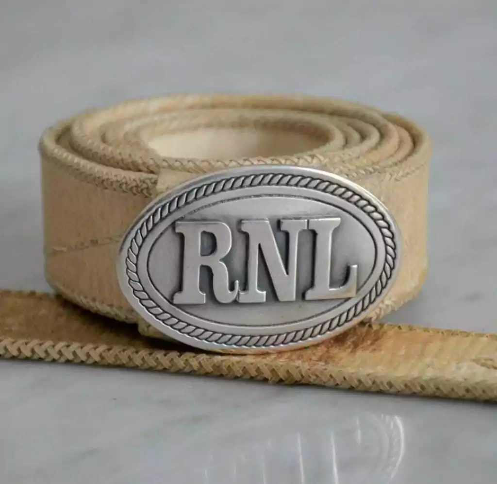Hebilla de Plata Silver, para personalizar con iniciales caladas y aplicadas (hasta tres iniciales) con Lonja de cuero crudo o carpincho.
